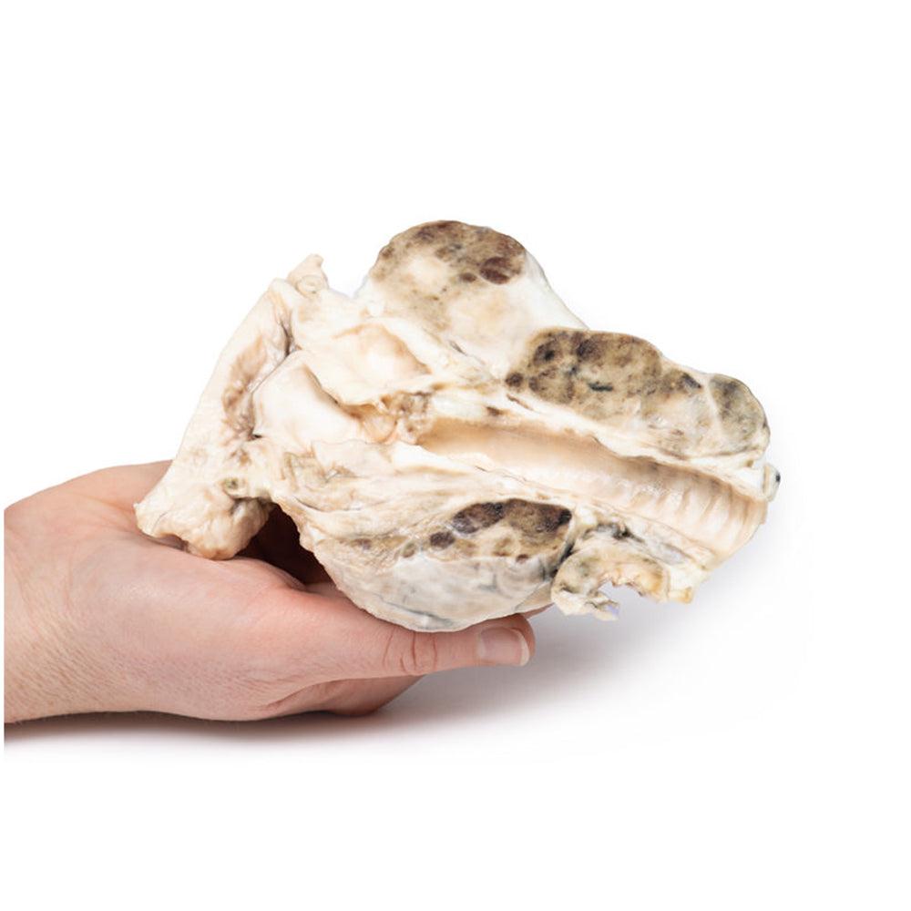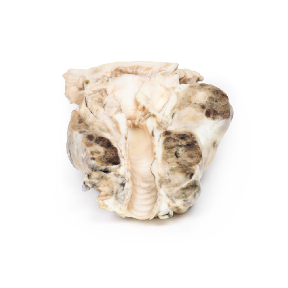 The model includes the base of the tongue, larynx and trachea. It has been cut in the coronal plane to allow a view of the internal laryngeal and tracheal anatomy.