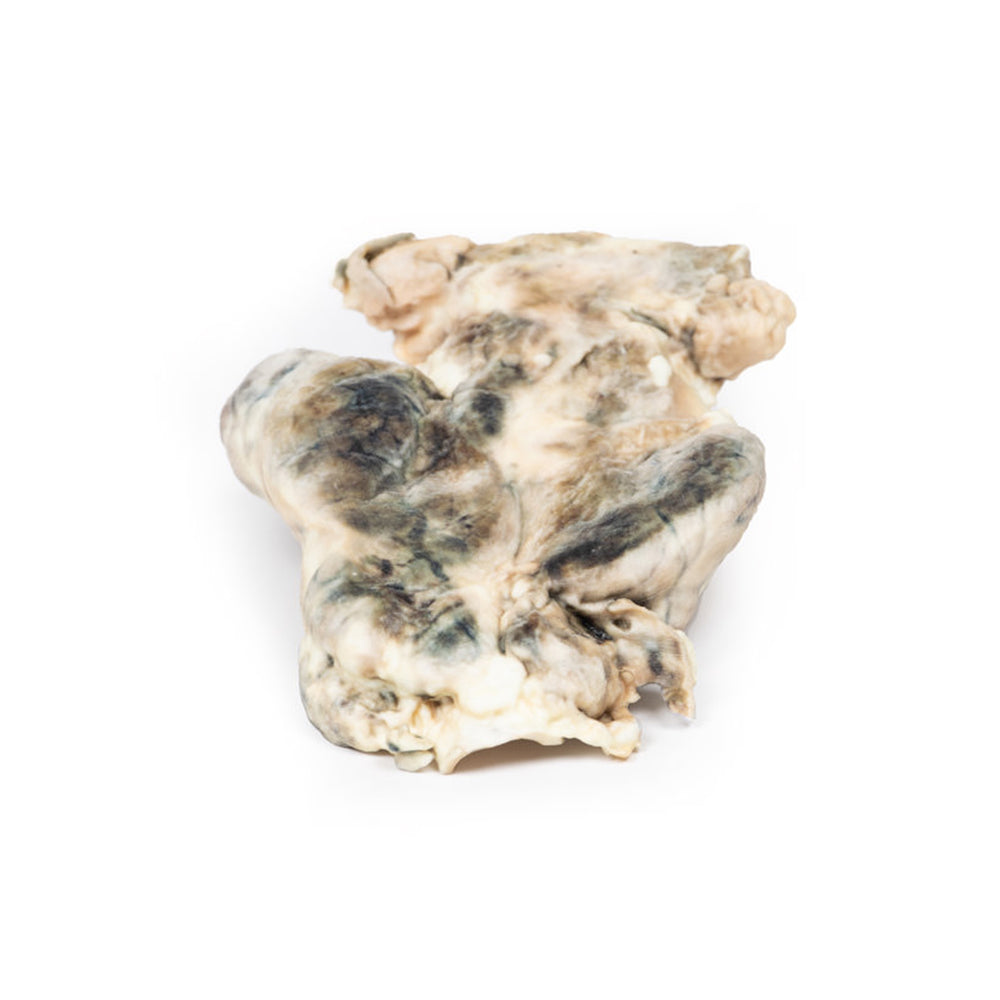 The thyroid gland is grossly enlarged, particularly the right lobe, which extends superiorly and inferiorly, well beyond its normal margins when viewed from the anterior aspect. The cut posterior surfaces display many hyper- and hypopigmented nodules as well as cystic areas in both lobes.