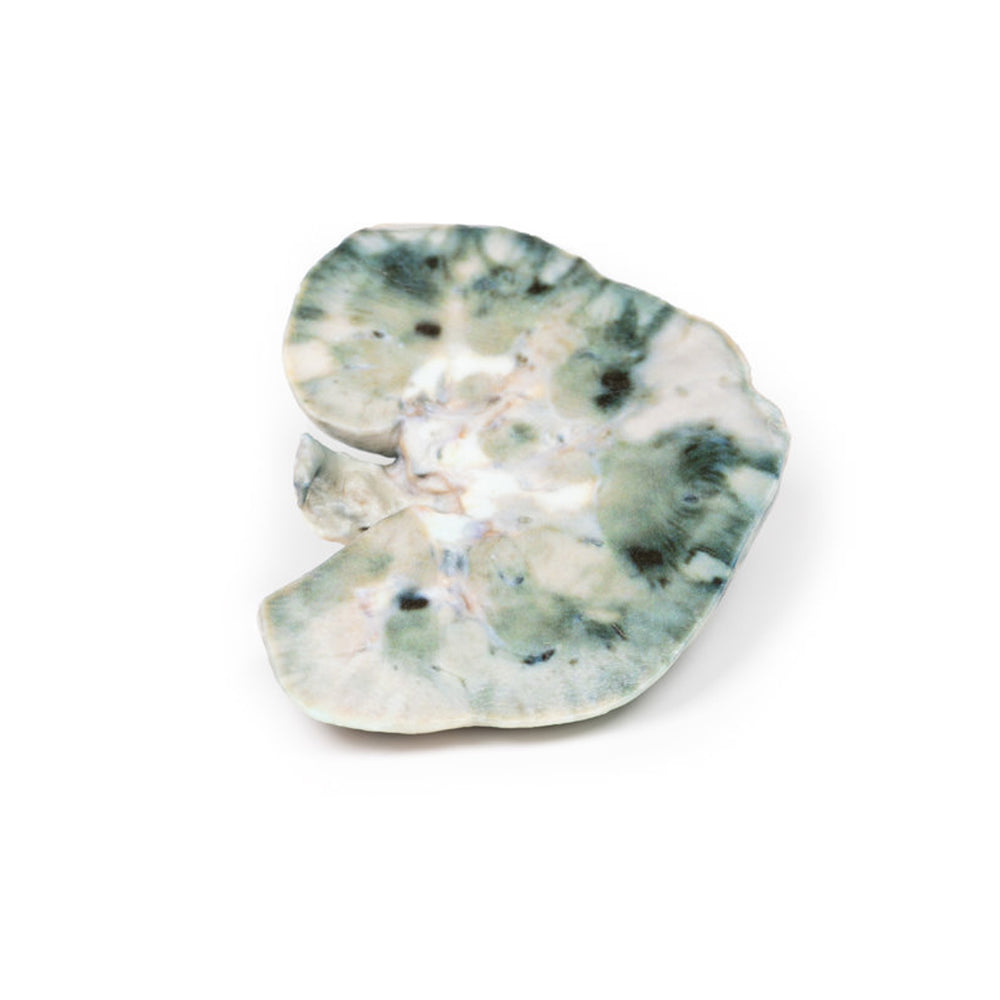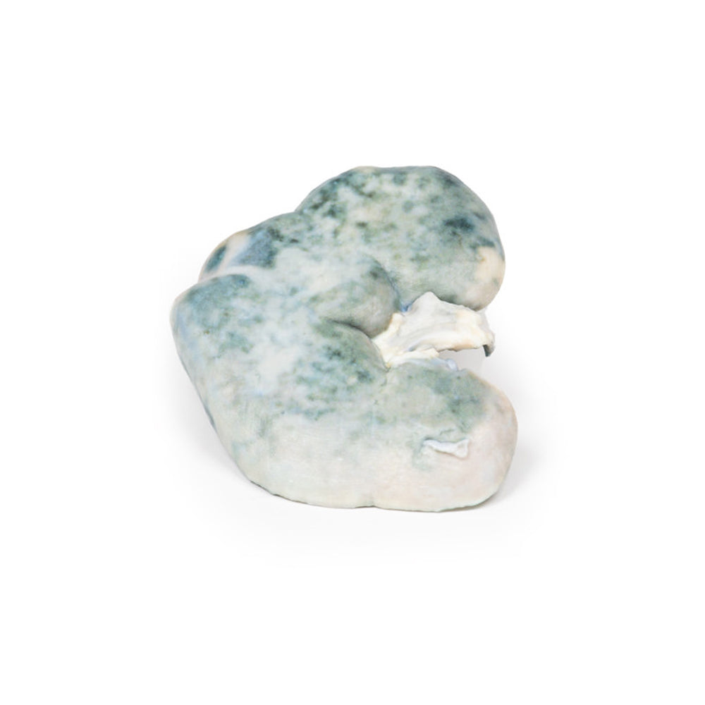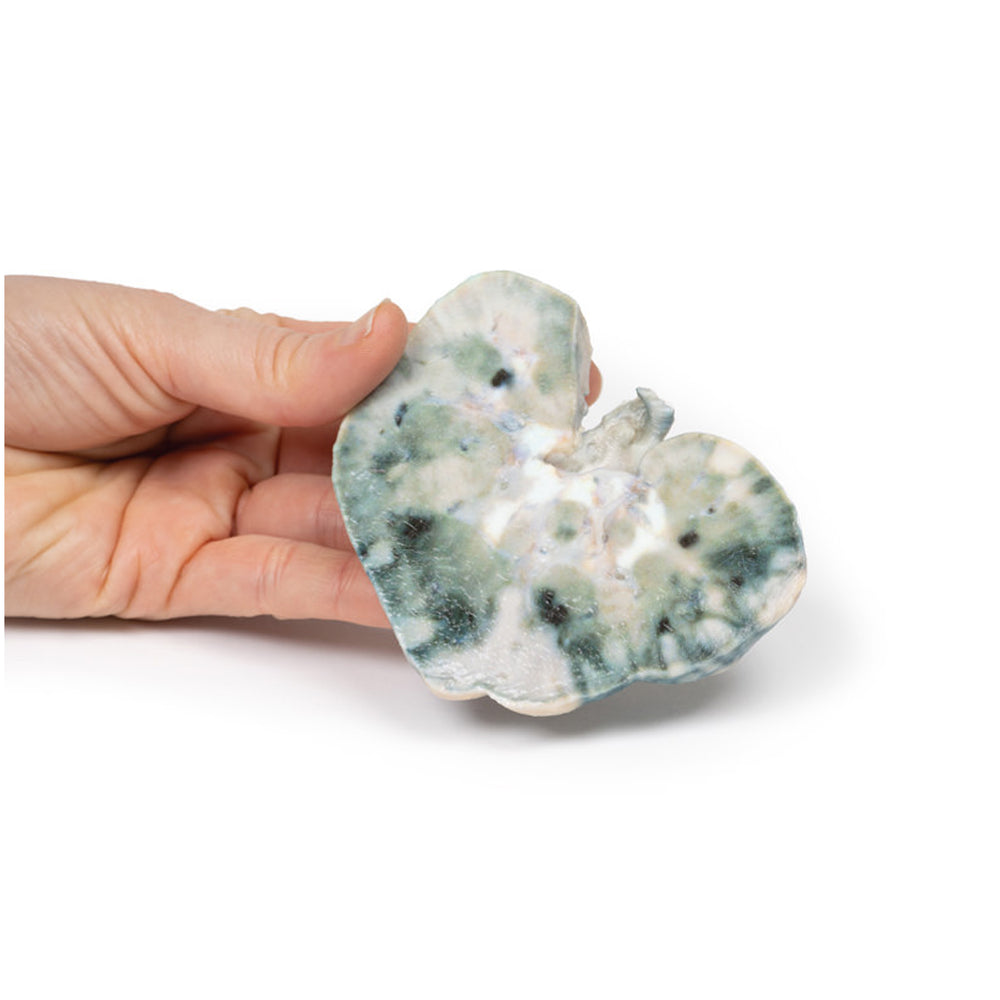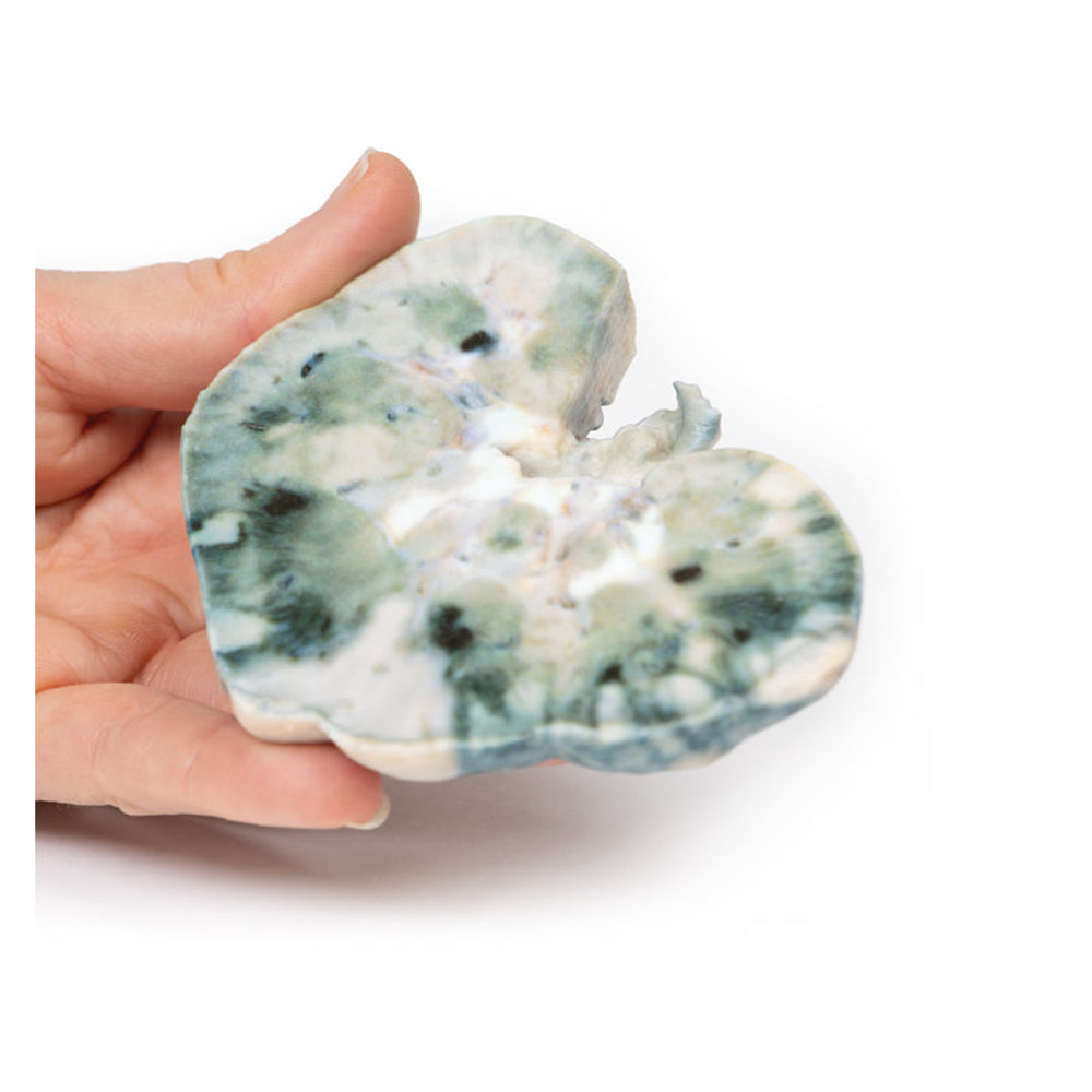 This is a model of a Kidney. The kidney has been bisected with a cut half surface on display. There are multiple well-demarcated wedge-shaped pale yellow-white areas evident within the cortex.