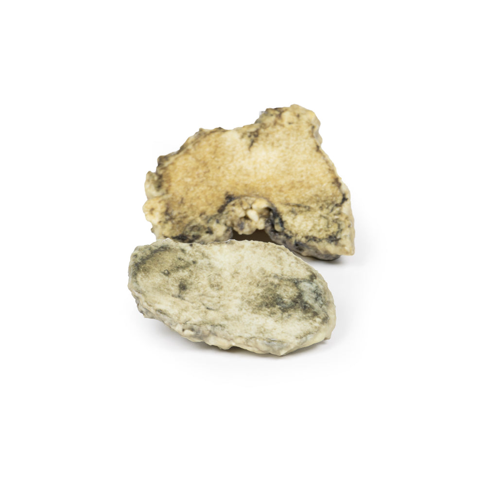 They are brown in colour, very irregular, and there are shaggy adhesions and plaques of yellow necrotic material. No normal articular cartilage is present. Some irregular, varying-in-size bony projections (up to 1 cm in diameter) are present on the femoral condyles.