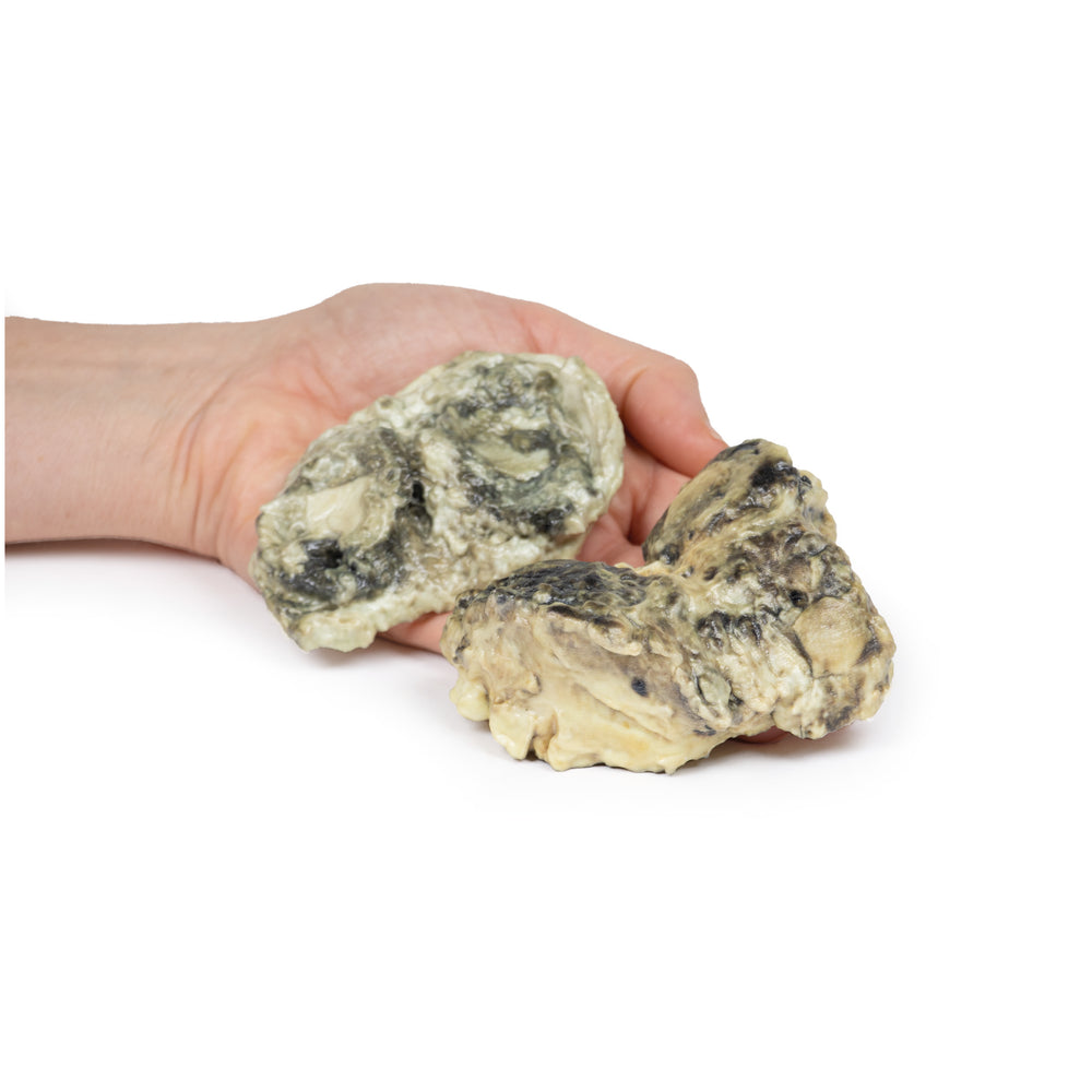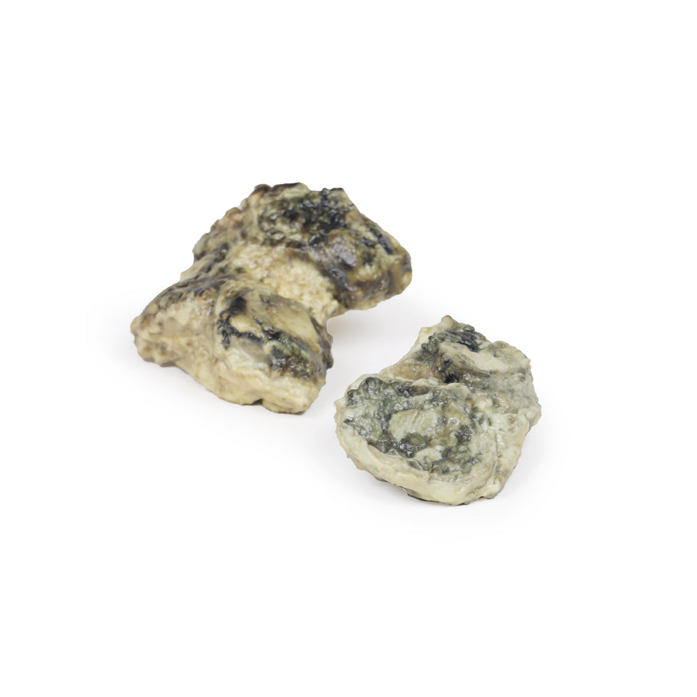 The 3D printed model displays the articular surfaces of a femur and tibia. The articular surfaces have been severely eroded.
