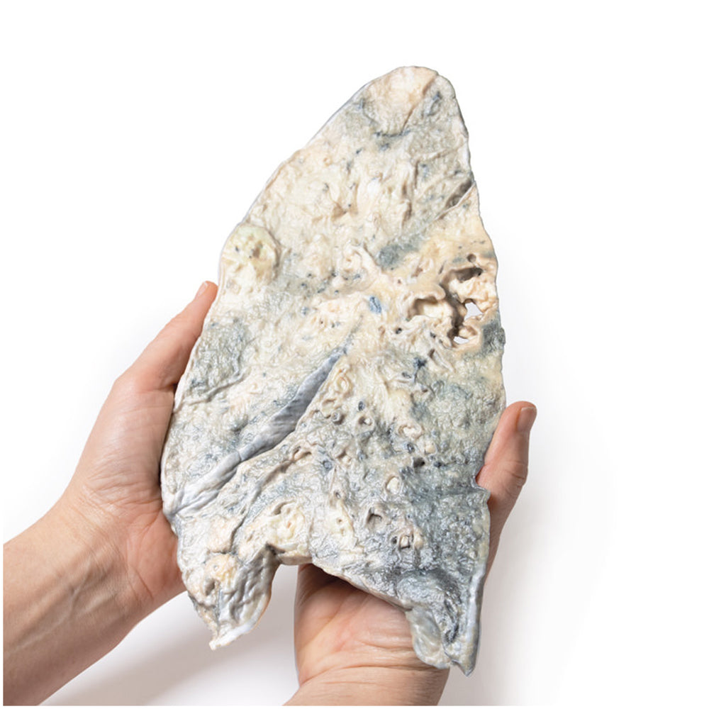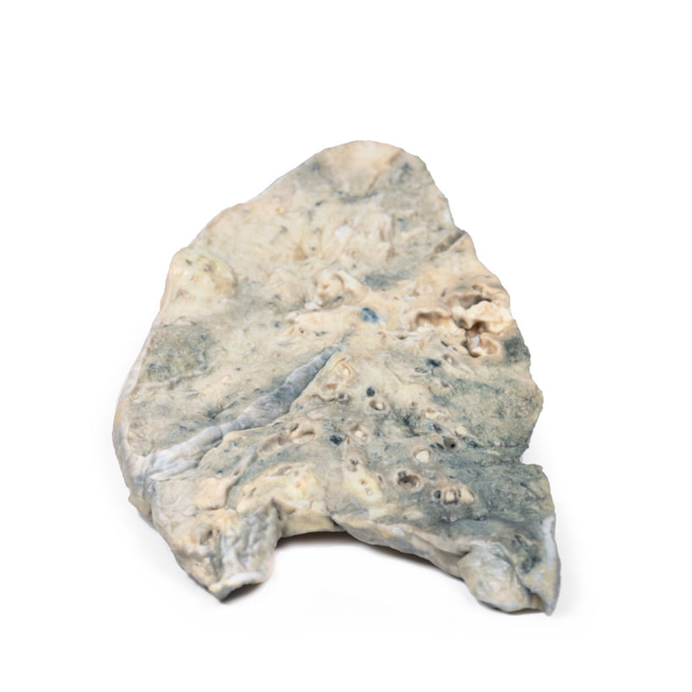 The right lung has been bisected. There are multiple irregular abscess cavities visible. The largest of these, in the apex of the lower lobe, measures 4 x 3 cm in diameter.