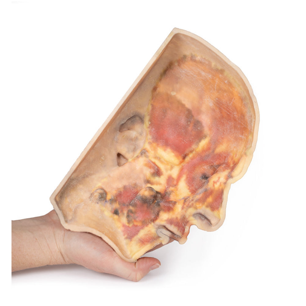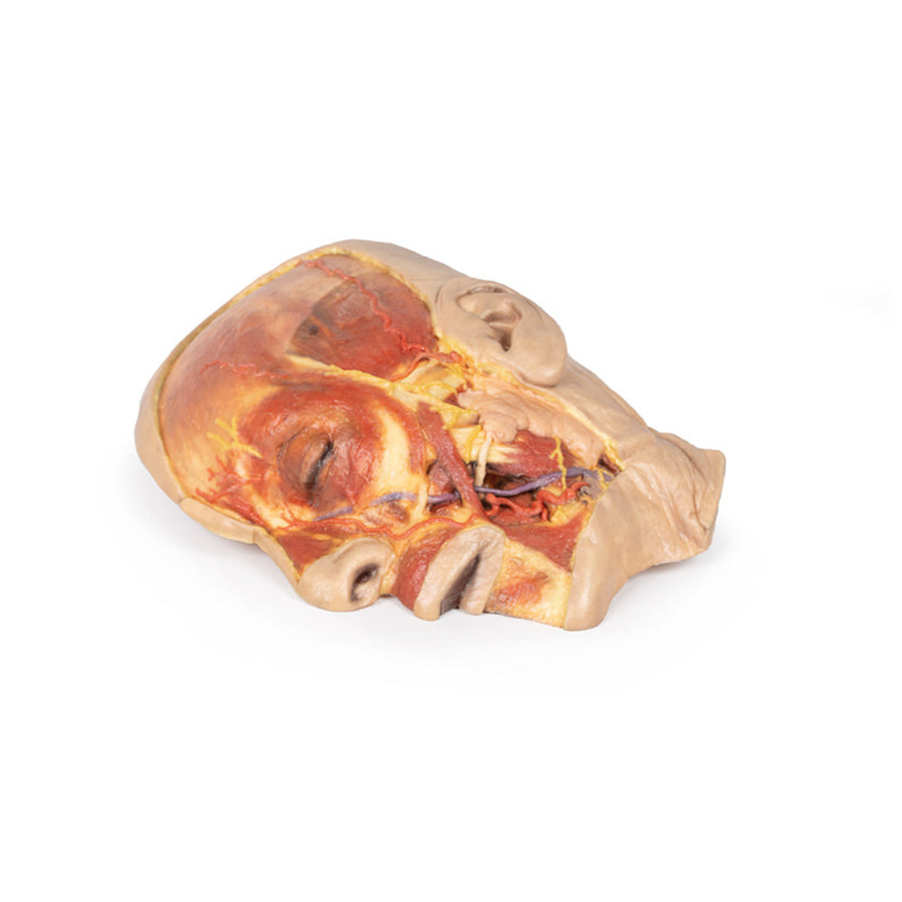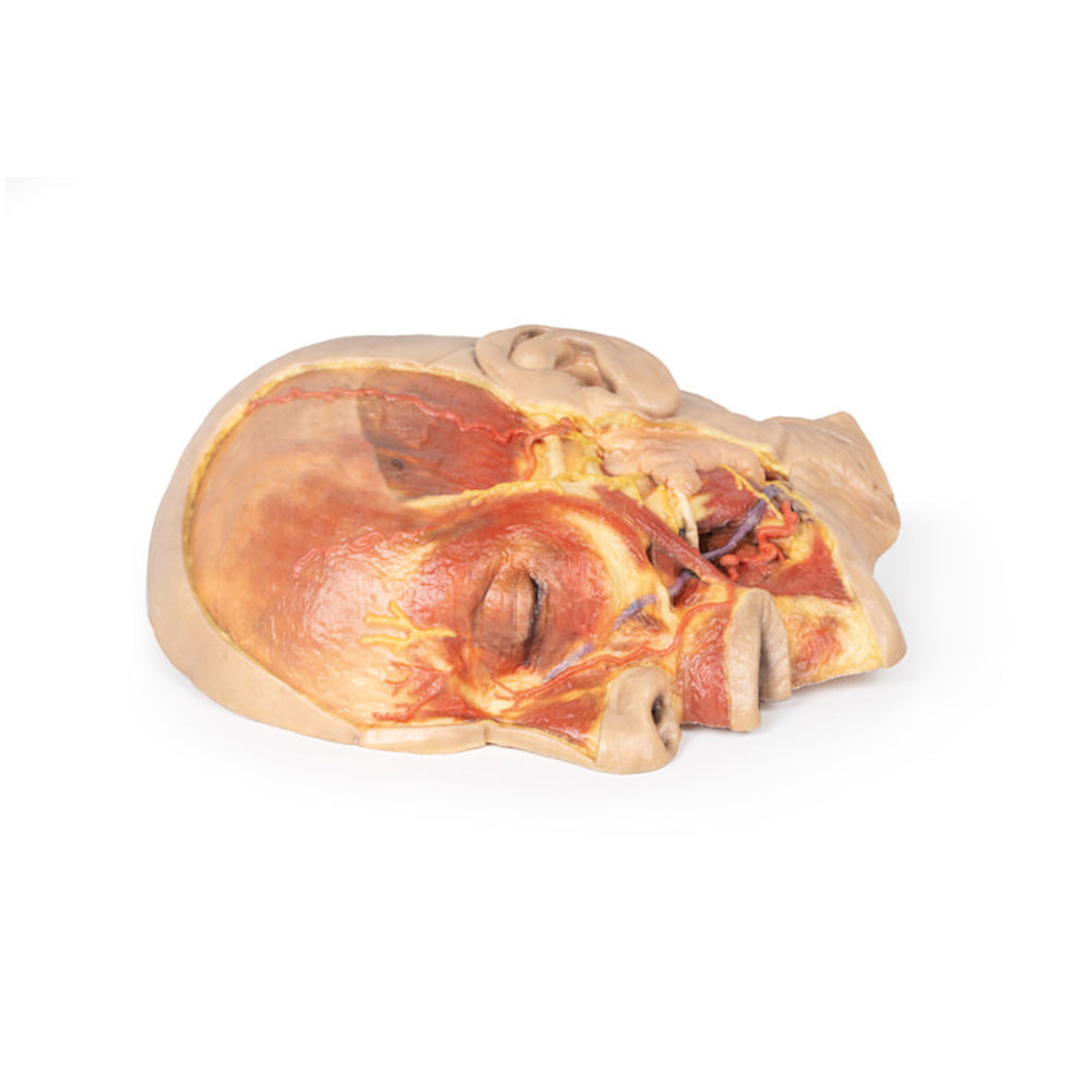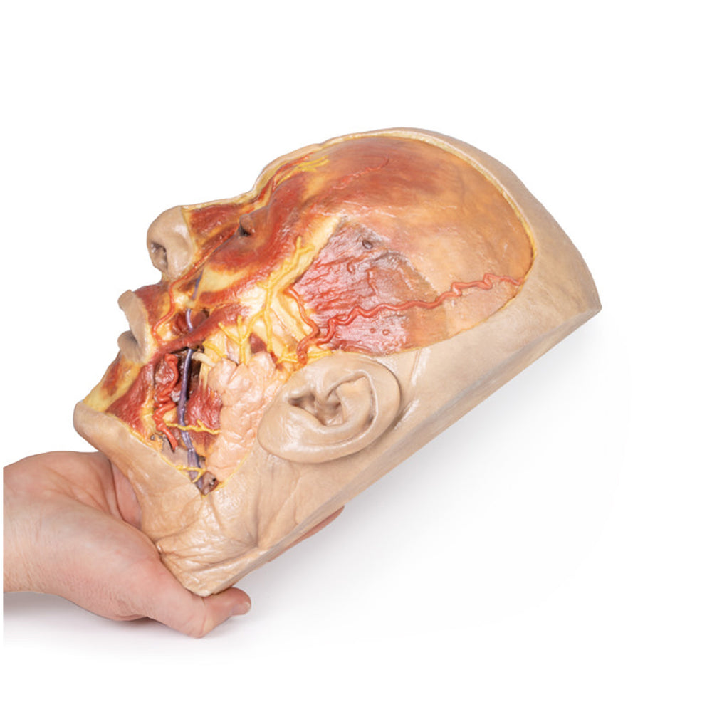 This model offers a concise yet richly detailed view of facial anatomy, ideal for teaching nerve-muscle-vascular relationships in the superficial face.